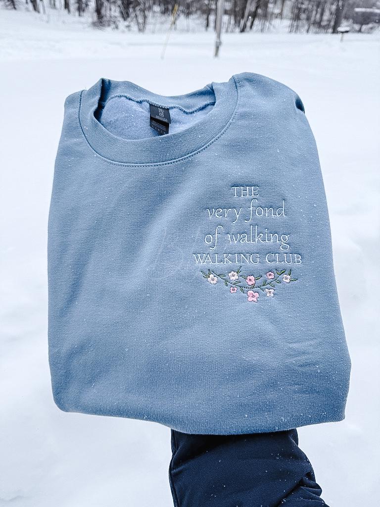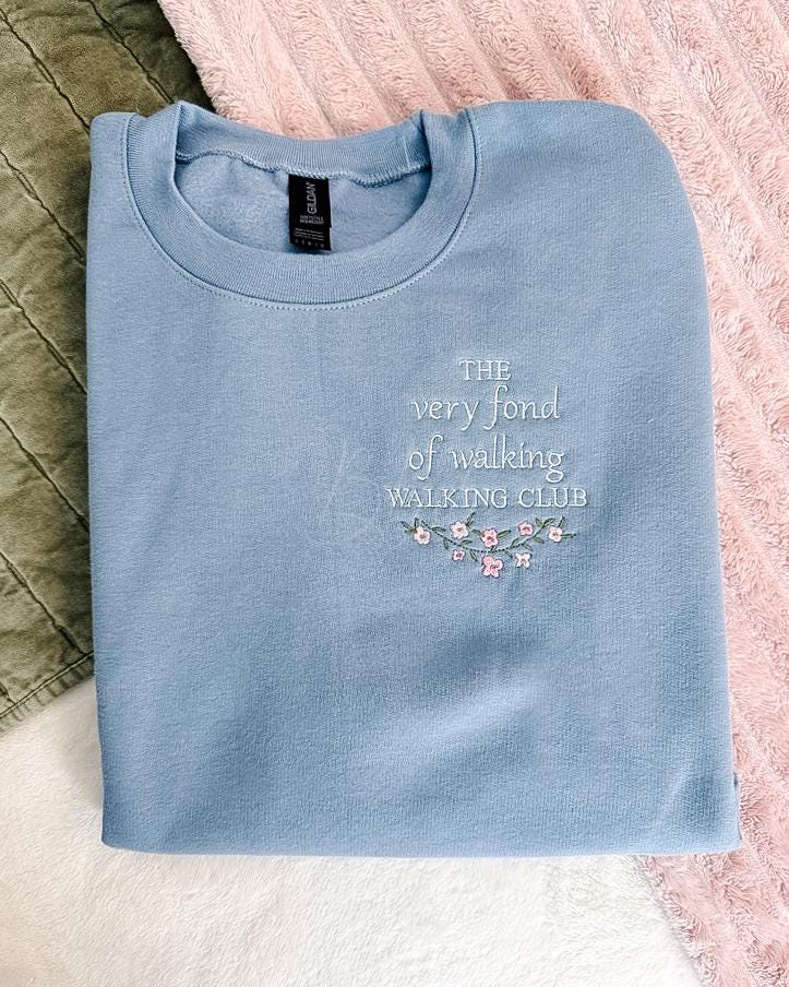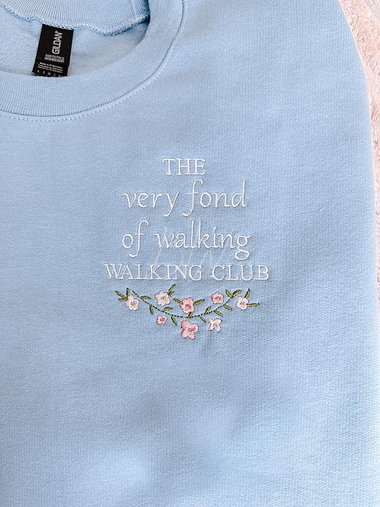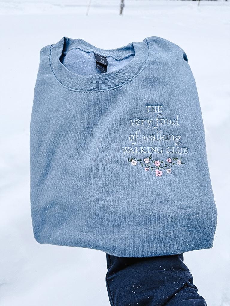This embroidered crewneck sweatshirt features the phrase “The Very Fond of Walking Walking Club”, inspired by Jane Austen’s Pride and Prejudice. This crewneck is perfect for lovers of long walks, classic literature, and subtle bookish humor.