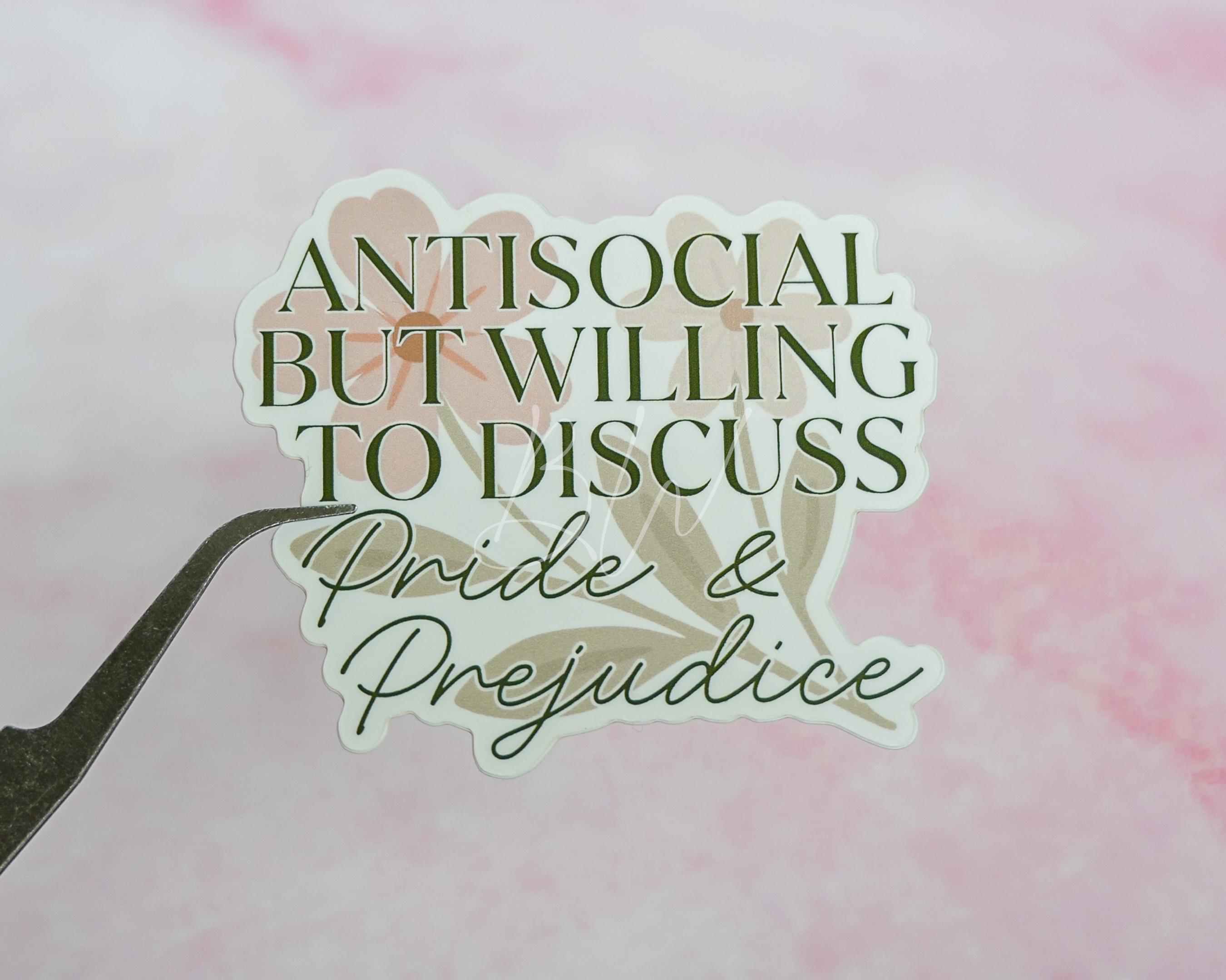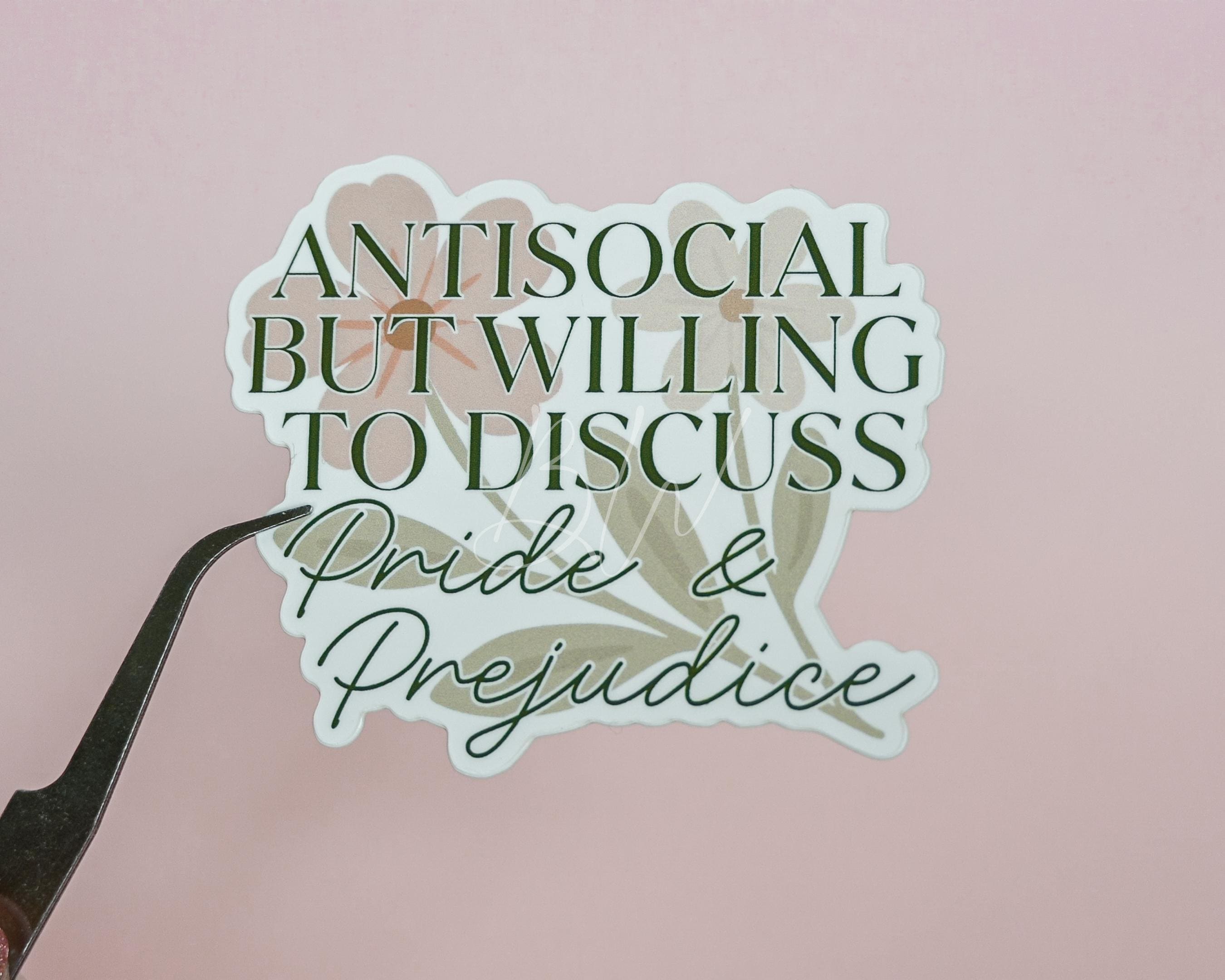 *This listing is for the ‘Antisocial but willing to discuss Pride and Prejudice sticker ONLY*